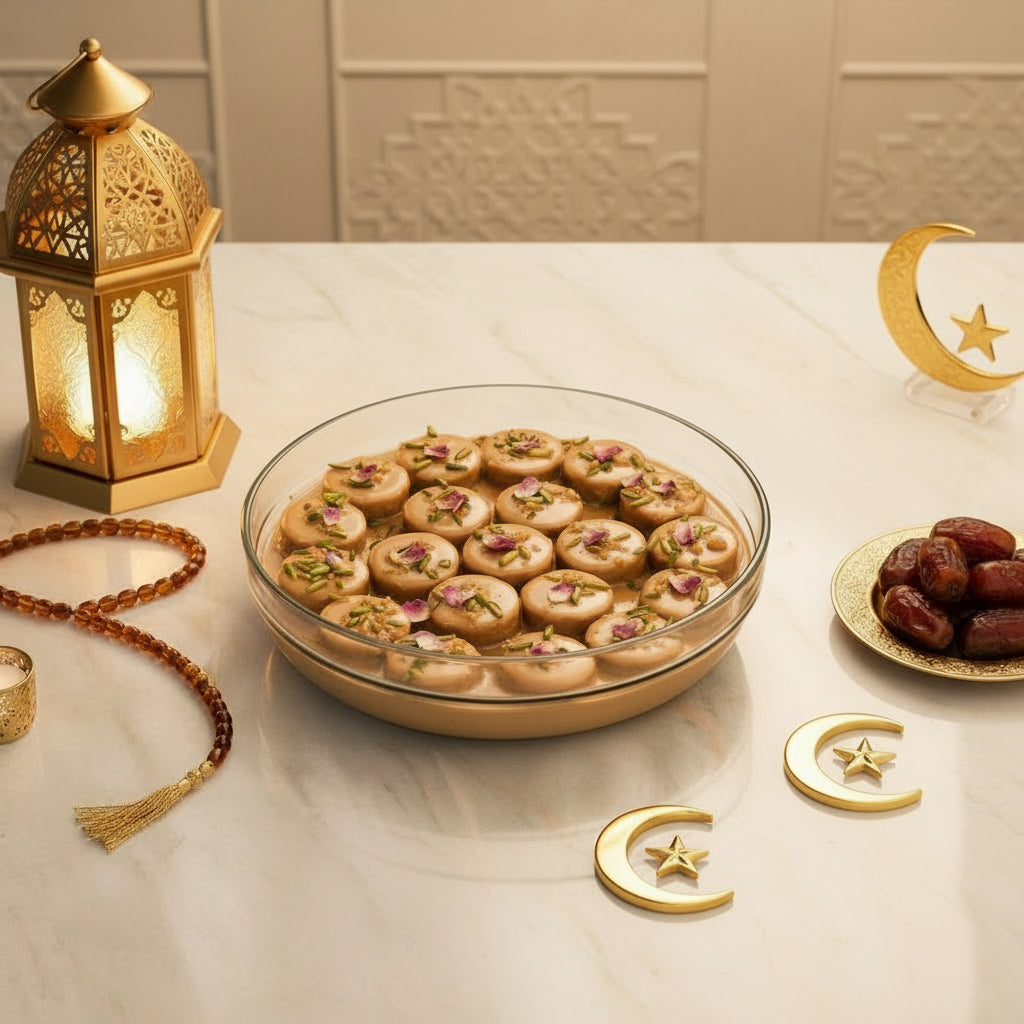 A soft and moist chocolate cake layered with smooth milk chocolate cream and delicate rose-infused cream. Topped with a light rose garnish and chocolate shavings for a perfect balance of floral and chocolate flavors. Elegant, romantic, and perfect for special Ramadan moments.